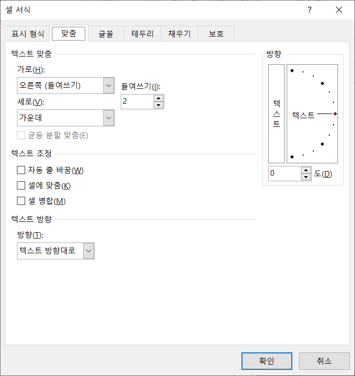 [맞춤] 탭을 선택하고 가로 항목에서 오른쪽(들여쓰기), 들여쓰기에 2를 입력합니다.