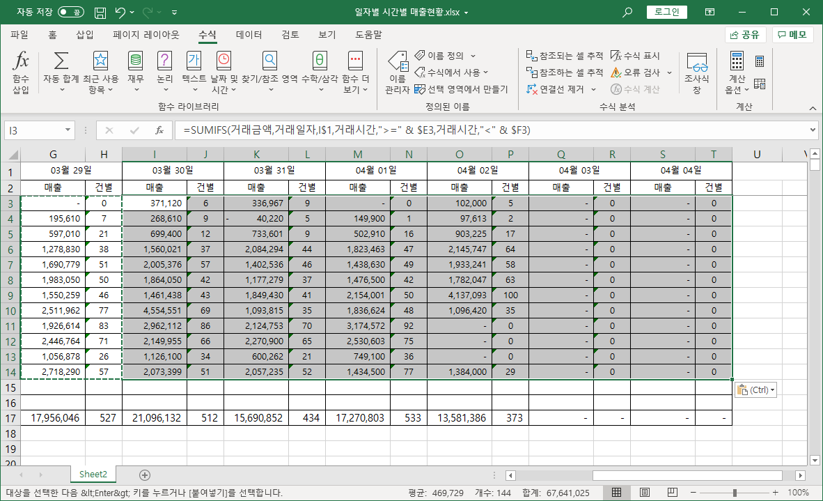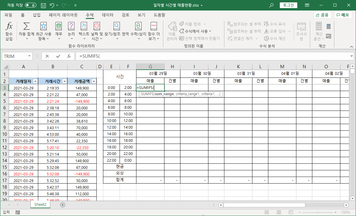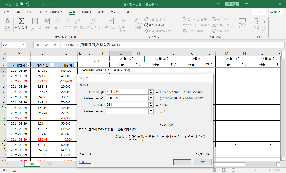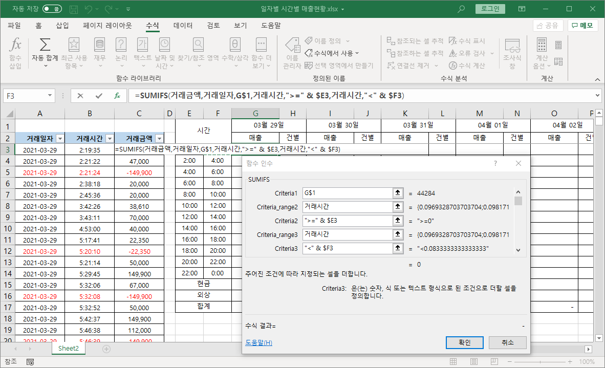 거래일자를 [G1] 셀에 있는 날짜와 같은지 비교하고, 거래시간을 [E3] 셀 시간보다 크거나 같고, [F3] 셀 시간보다 작은지 비교해서 매출 현황을 구하려고 합니다.