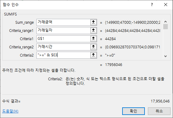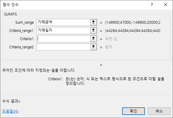 Sum_range 인수에 거래금액을 직접 입력하고, Criteria_range1 인수에 거래일자를 직접 입력합니다.