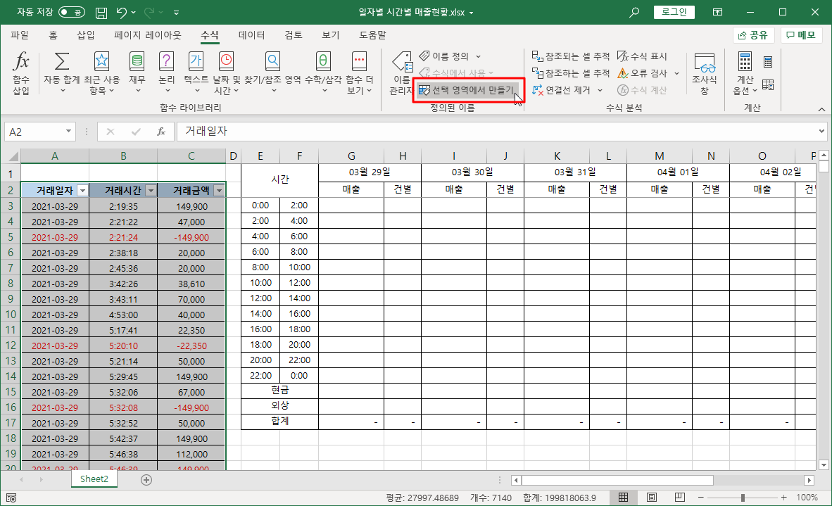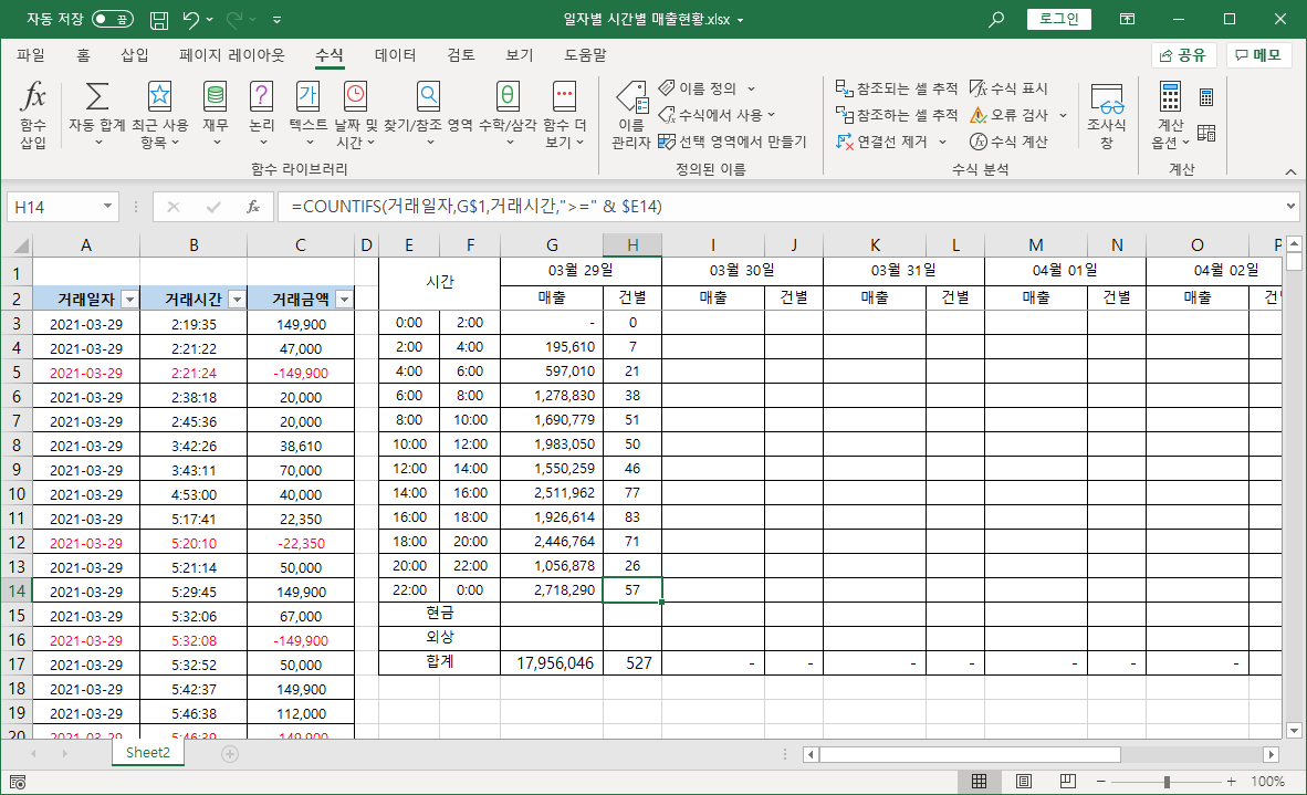 거래시간이 [E3] 셀의 0시보다 크거나 같고, [F3] 셀의 2시보다 작은 경우를 조건으로 지정했습니다.