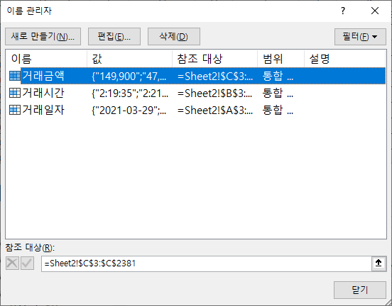 단축키 <Ctrl + F3>을 눌러 이름 정의된 항목을 확인 합니다.