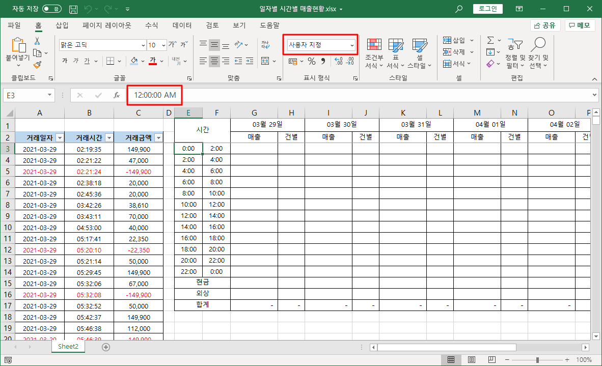 거래일자와 거래시간, 거래금액이 저장된 데이터가 있습니다.