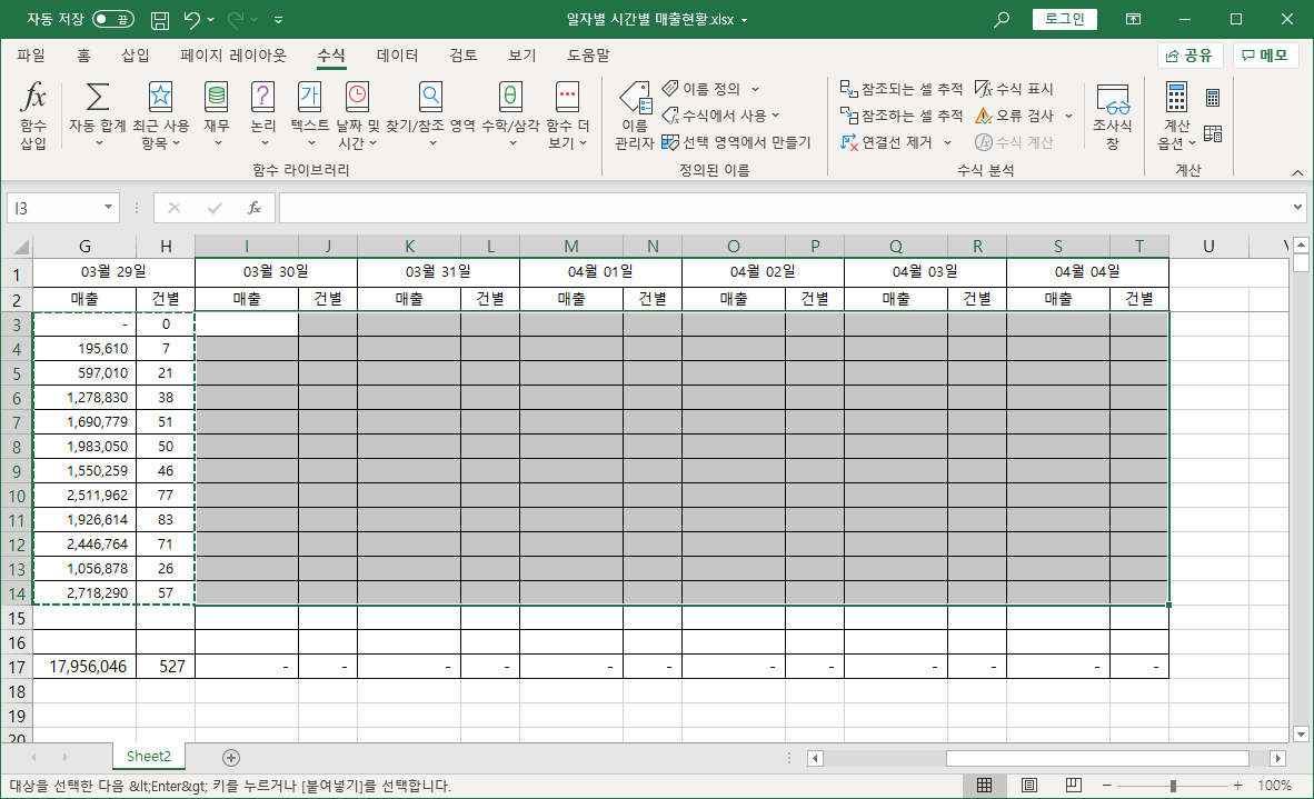 이 데이터를 일자별 시간별로 나누어 거래금액 합계와 거래건수를 나타내려고 합니다.