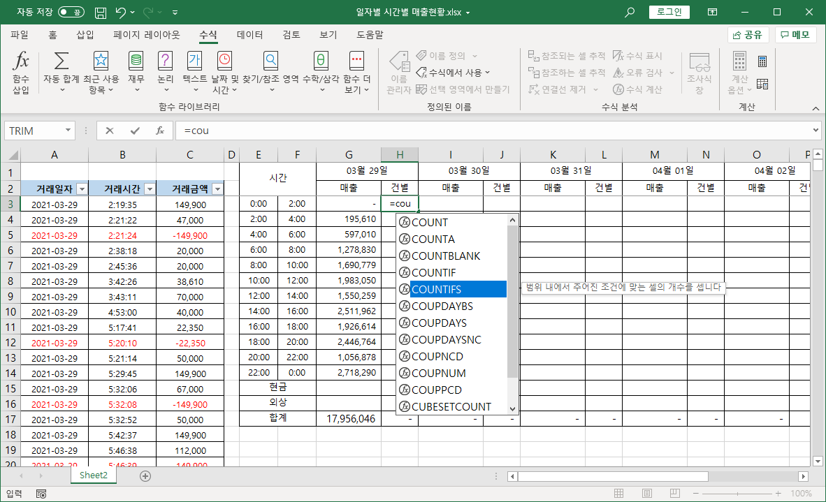 =cou 까지 입력한 뒤 함수 목록에서 COUNTIFS를 더블 클릭합니다.