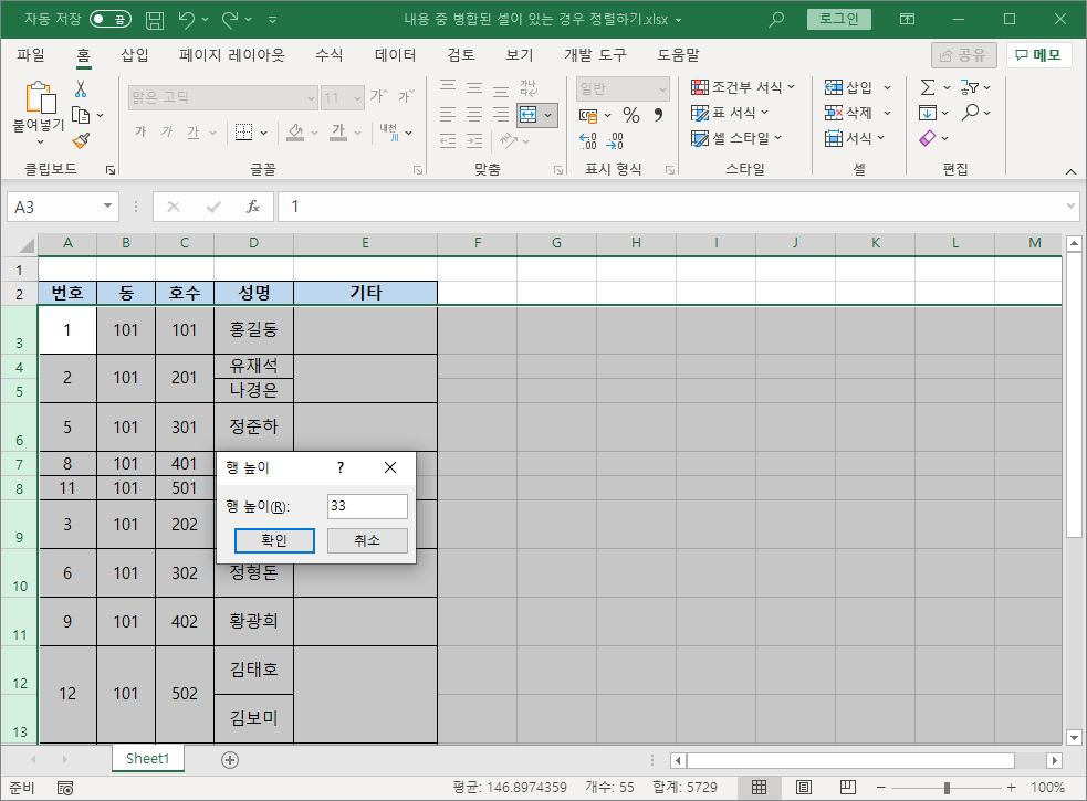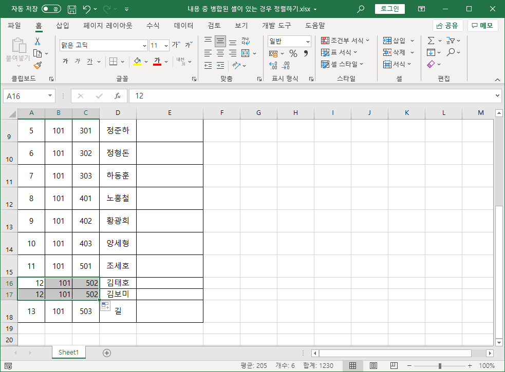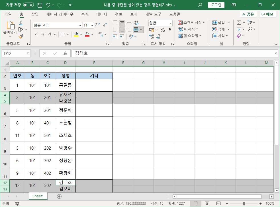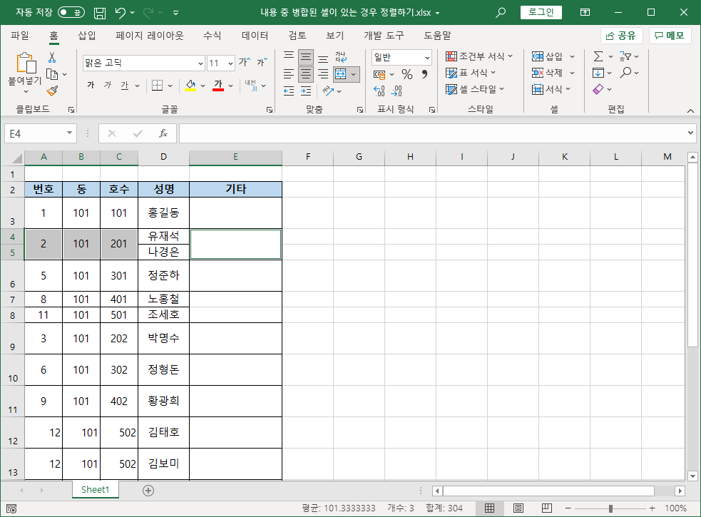서식은 좀 있다 처리하기로 하고, 먼저 정렬하기 위해서는 병합이 해제되어 새로 표시된 빈 셀을 채워야 합니다.