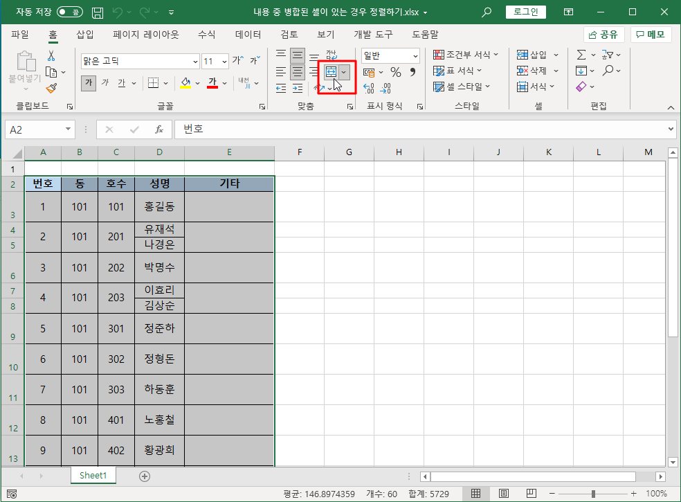 선택된 범위 안에 한 셀이라도 병합된 셀이 있는 경우 [병합하고 가운데 맞춤]을 누르면 병합된 셀을 병합 해제하는 동작이 실행됩니다.