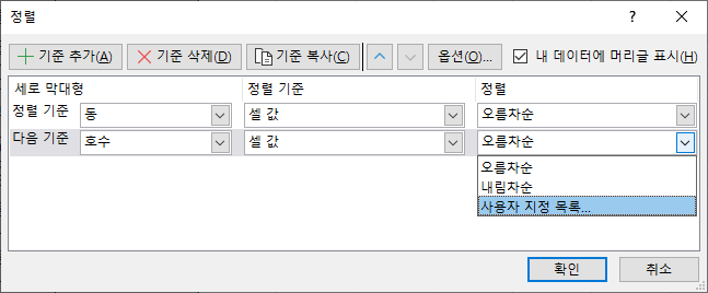 라인별로 정렬하기 위해 '오름차순'을 눌러 '사용자 지정 목록'을 선택합니다.