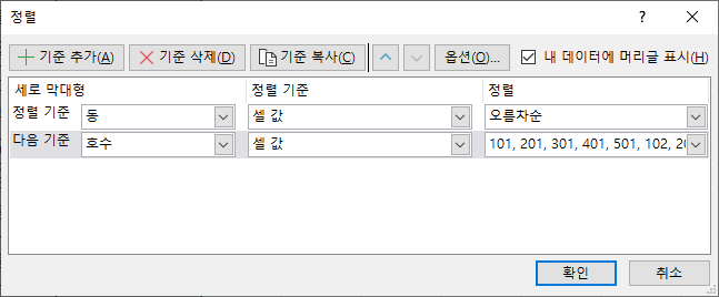 [기준 추가]를 누르고 [정렬 기준]은 '호수'를 선택합니다.