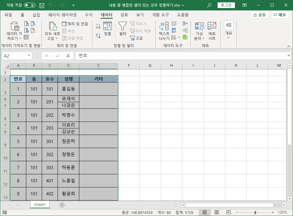 문서를 만들 때 엑셀 기능을 고려하지 않고 예전에 만들던 모양 그대로 만드는 경우가 있는데, 지금 예제와 같은 내용 중 병합이 되어 있는 경우나 제목이 병합되어 있는 경우가 있습니다.