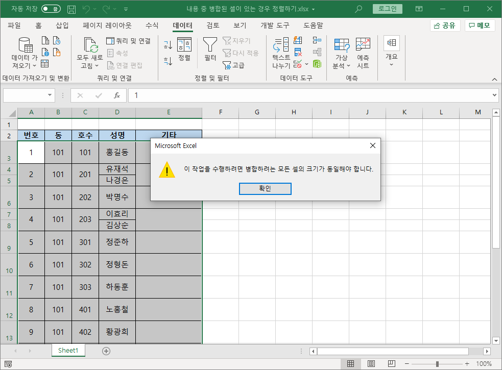 경고 메시지 창의 내용인 '이 작업을 수행하려면 병합하려는 모든 셀의 크기가 동일해야 합니다.' 의미는 선택된 셀 중 일부 셀이 다른 셀과 달리 병합되어 있기 있다는 것입니다.