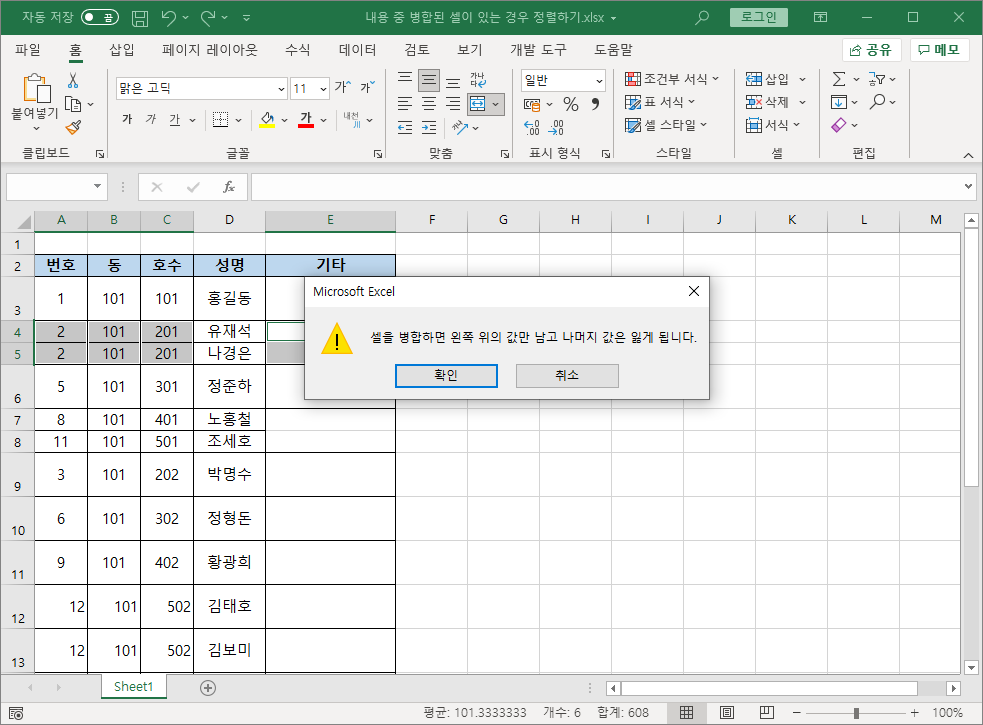병합될 셀에 데이터가 있기 때문에 경고창이 표시됩니다.