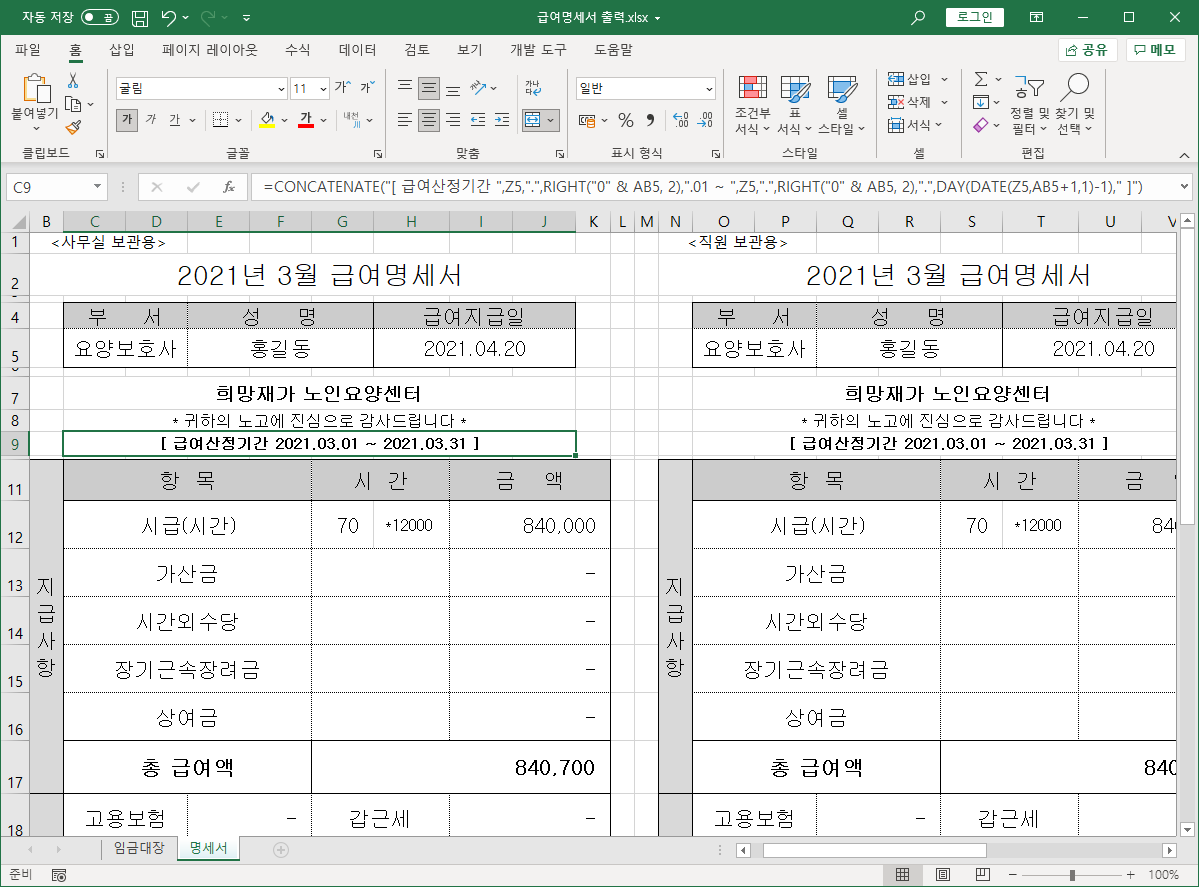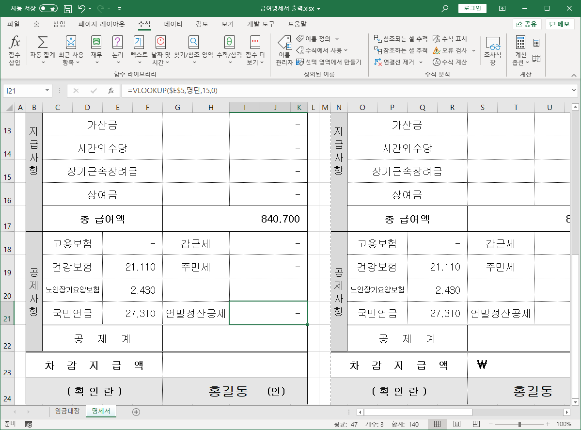 급여명세서는 두 장을 만드는데, 왼쪽 사무실 보관용 부분을 완성하면 오른쪽 직원 보관용 부분은 셀을 연결해 나타내도록 합니다.