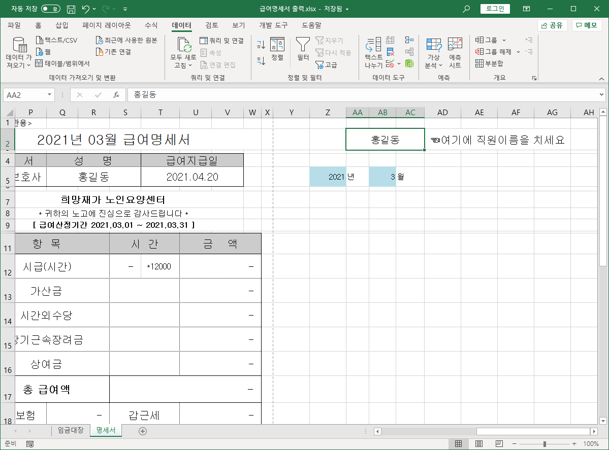 이렇게 임금대장 시트에 내용을 입력하면 명세서 시트에 나타나도록 수식을 작성했습니다.