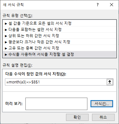 수식을 사용하여 서식을 지정할 셀 결정을 선택하고 수식으로 조건을 지정합니다.