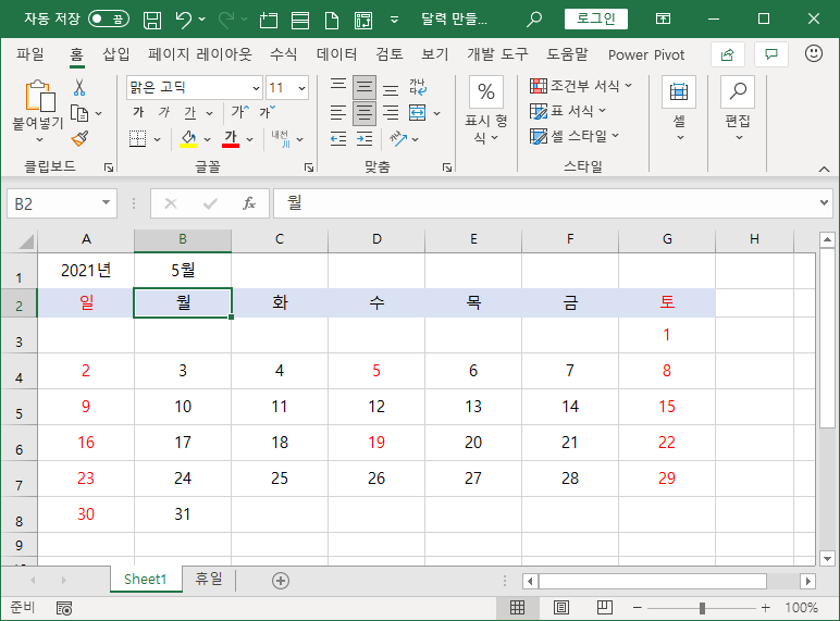 달력 만들기 - 날짜 함수, 조건부 서식, 유효성 검사, 표시 형식