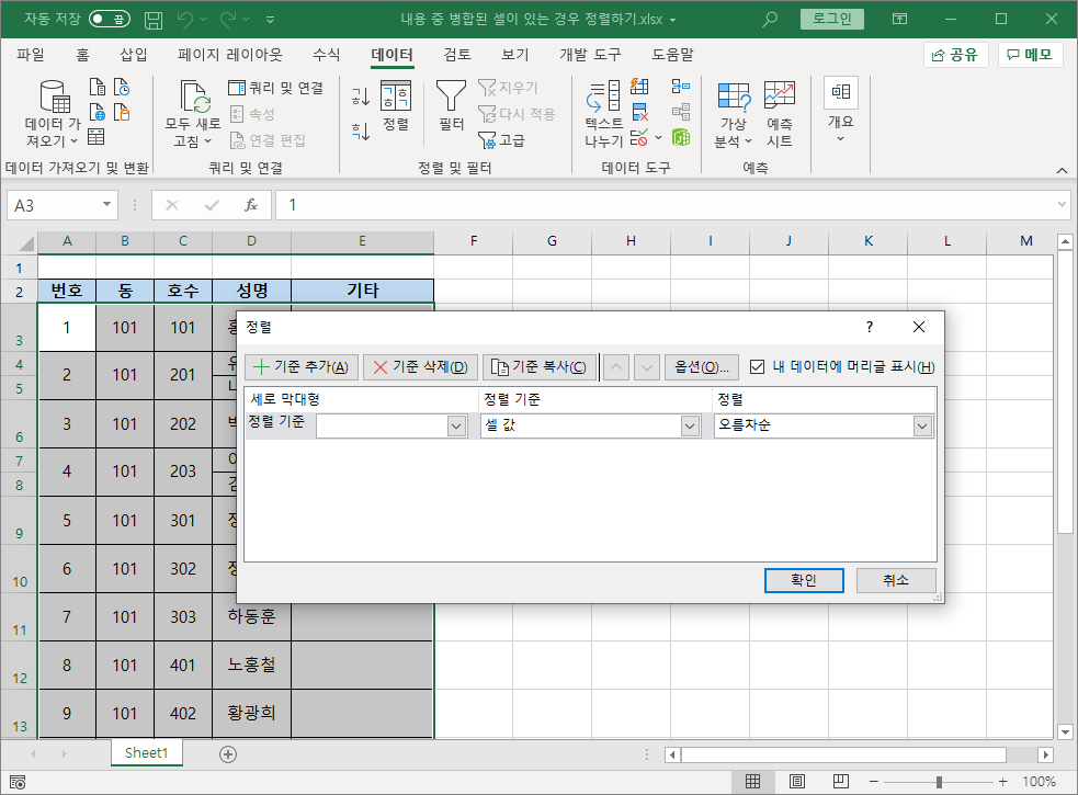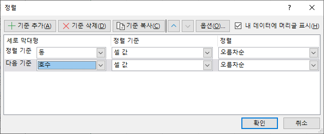 [기준 추가]를 누르고 [정렬 기준]은 '호수'를 선택합니다.
