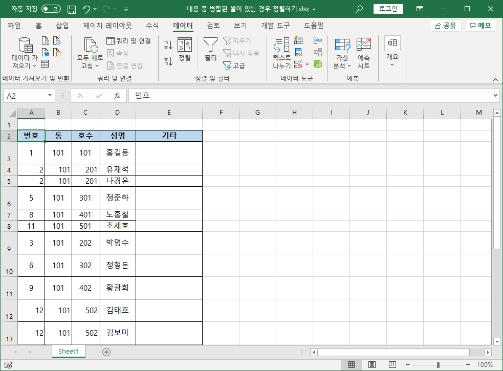 문서를 만들 때 엑셀 기능을 고려하지 않고 예전에 만들던 모양 그대로 만드는 경우가 있는데, 지금 예제와 같은 내용 중 병합이 되어 있는 경우나 제목이 병합되어 있는 경우가 있습니다.
