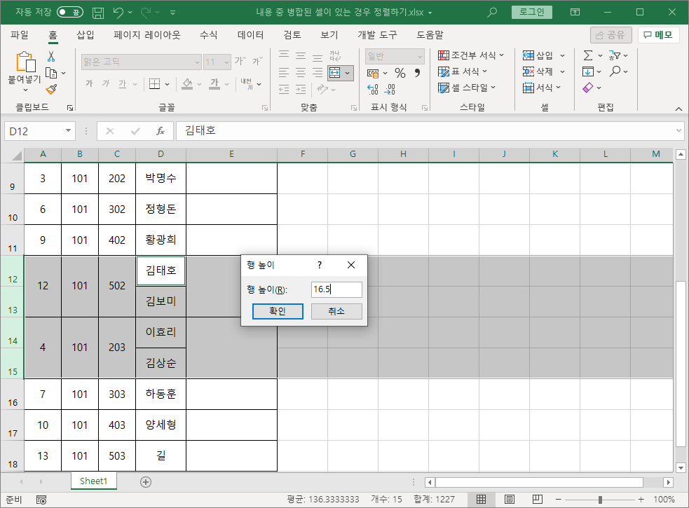 병합된 셀이 있는 행만 선택해 행높이를 16.5로 설정합니다.