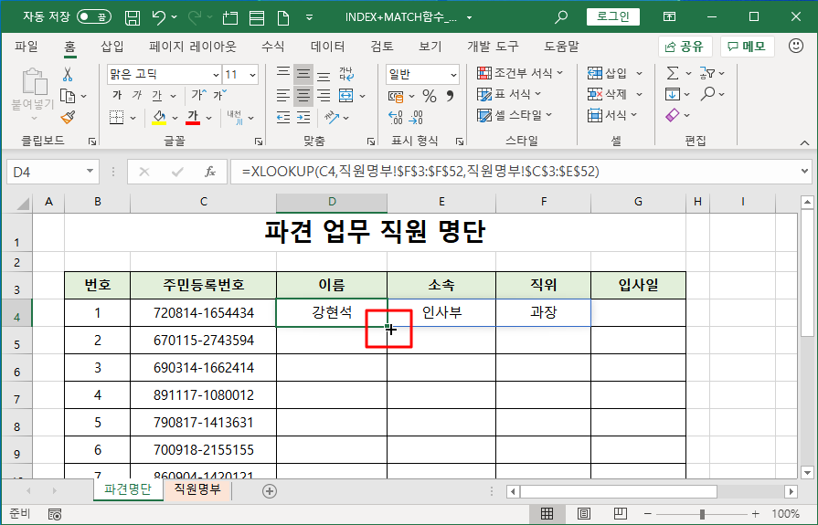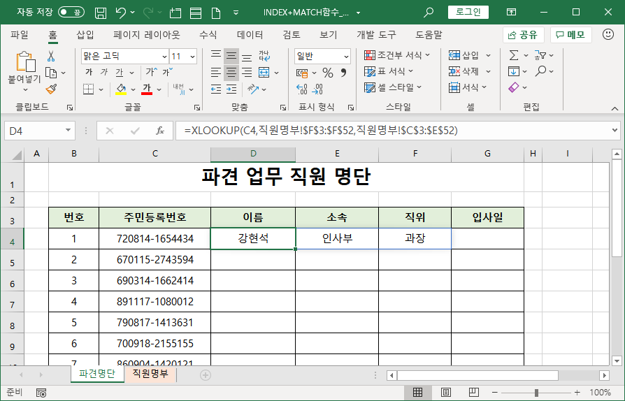 주민등록번호를 이용해 이름을 찾으려고 하는데, 직원명부 시트에서 주민등록번호 왼쪽 열에 이름이 있기 때문입니다.