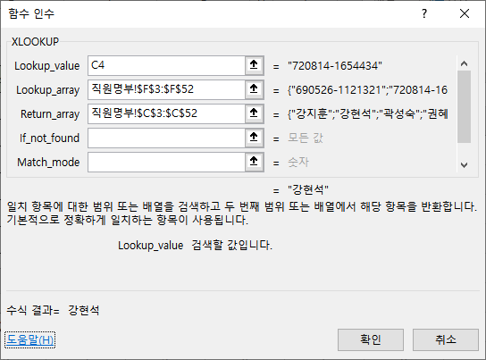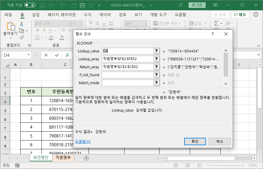 Return_array 인수에 참조표에서 이름이 입력되어 있는 열 범위 [직원명부!C3:C52]를 선택하고 절대 참조합니다.