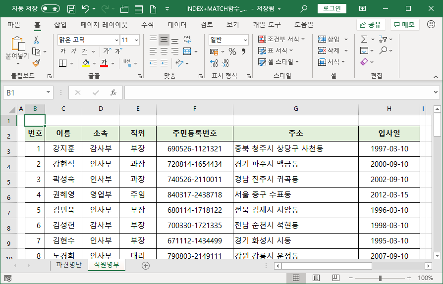 직원명부 시트에 직원 상세 정보가 입력되어 있습니다.