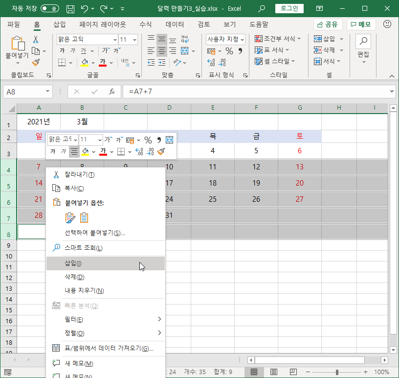 선택된 영역에서 마우스 오른쪽 단추를 눌러 [삽입]을 선택합니다.