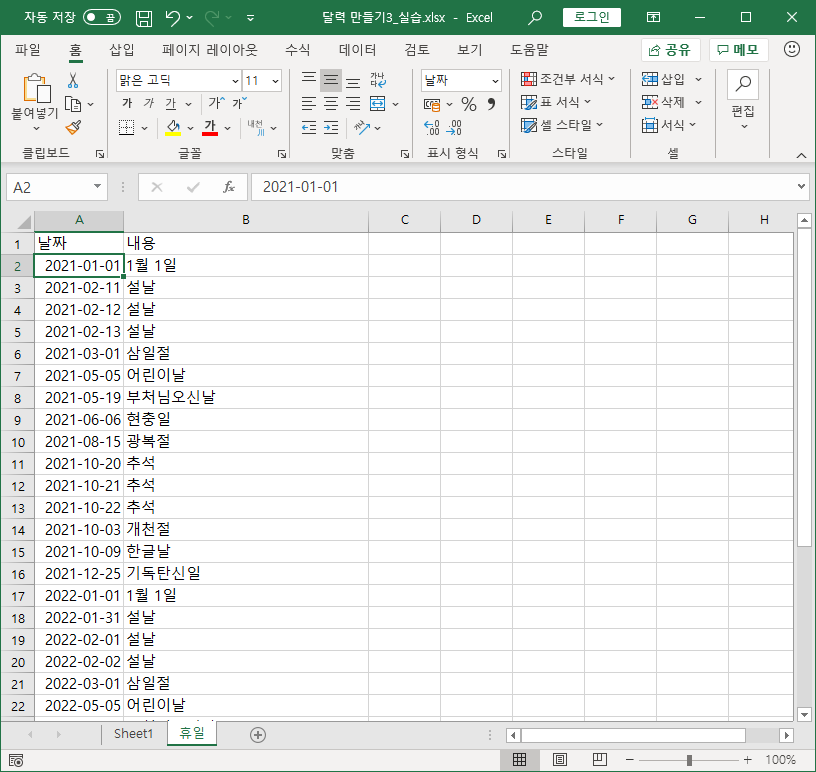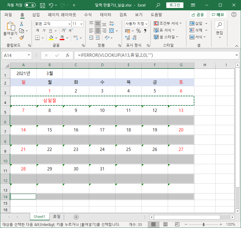 이왕 휴일 시트에 휴일 날짜와 내용을 입력해 두었으니 달력에서 휴일을 나타낼 때 내용도 같이 표시하도록 수정해 보겠습니다.