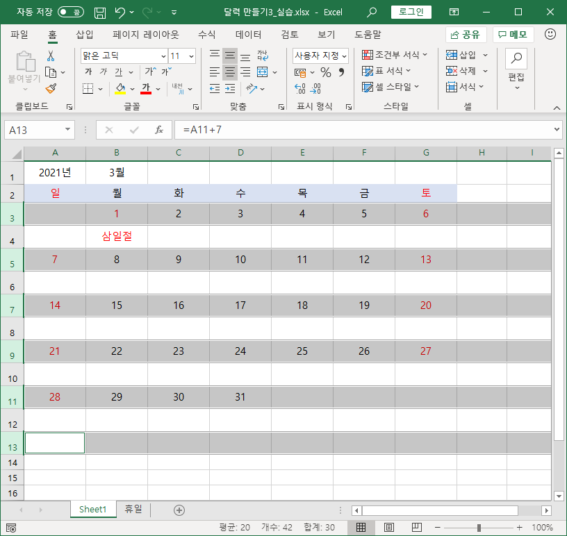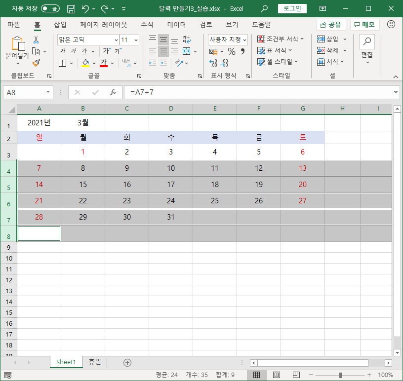 달력 만들기 - 날짜 함수, 조건부 서식, 유효성 검사, 표시 형식