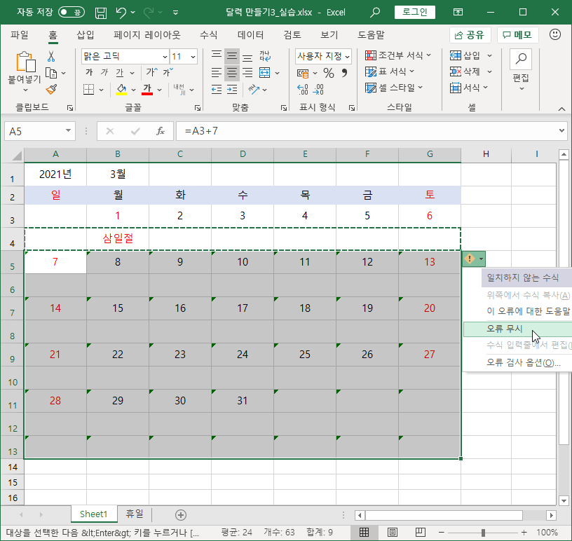 상관없긴 하지만 보기 불편하니 [A5:G13] 셀 범위를 선택한 뒤 오른쪽 위에 표시되는 수식 오류 노란색 느낌표를 눌러 오류 무시를 선택합니다.