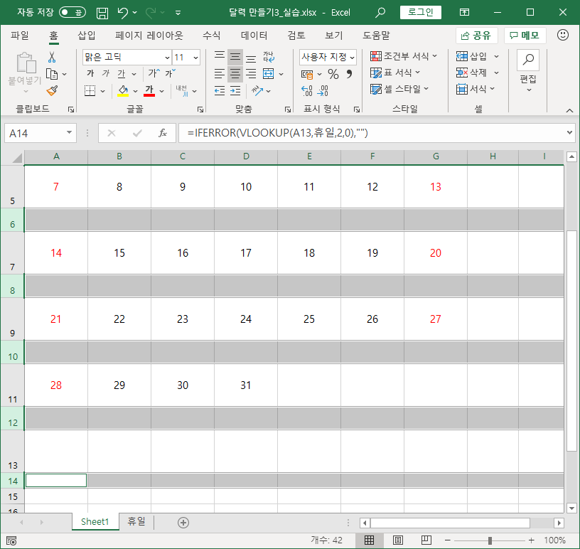 날짜가 표시되는 행은 행높이를 45로 늘리고, 휴일 내용이 표시되는 행은 행높이를 16.5로 줄입니다.