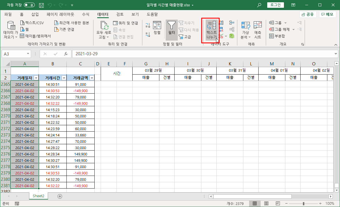 거래일자와 거래시간, 거래금액이 저장된 데이터가 있습니다.