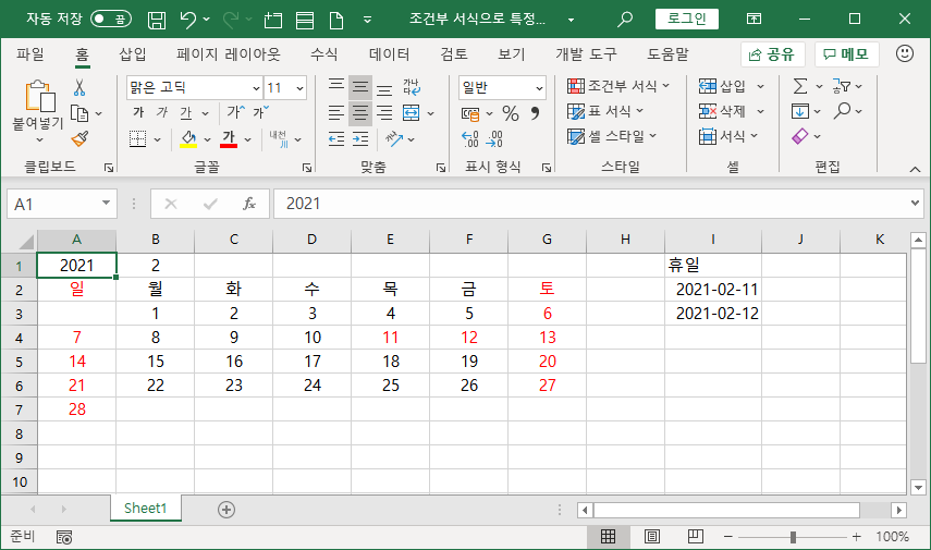 달력으로 나타낸 영역에서 사용자가 입력한 특정 날짜를 휴일에 해당하는 글꼴 색으로 조건부 서식을 이용해 나타내는 방법을 소개하겠습니다.