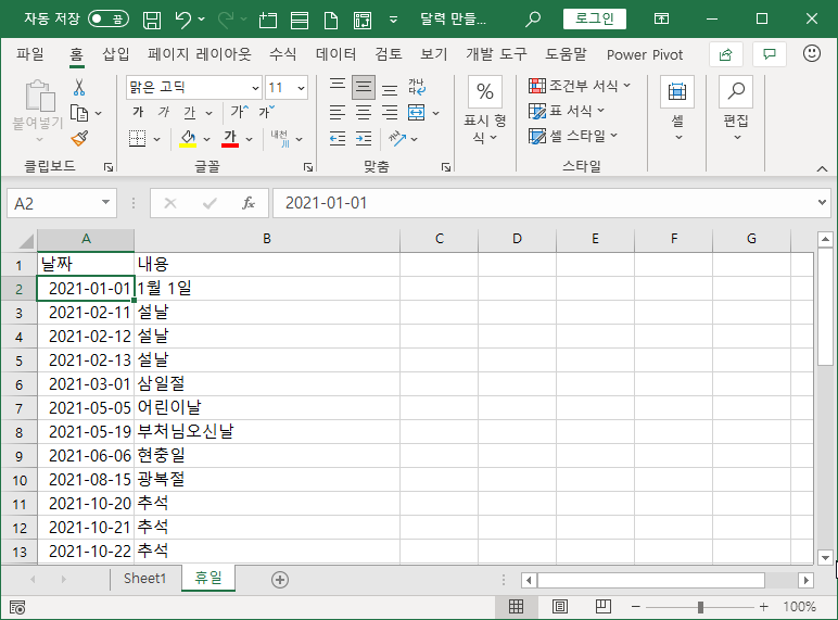 [A2] 셀부터 차례대로 2021, 2022년 휴일 데이터를 입력합니다.
