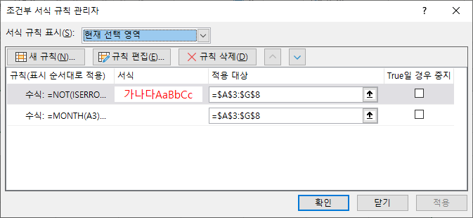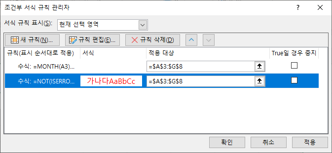 동일 영역에 조건부 서식이 두 개 지정되어 있습니다.