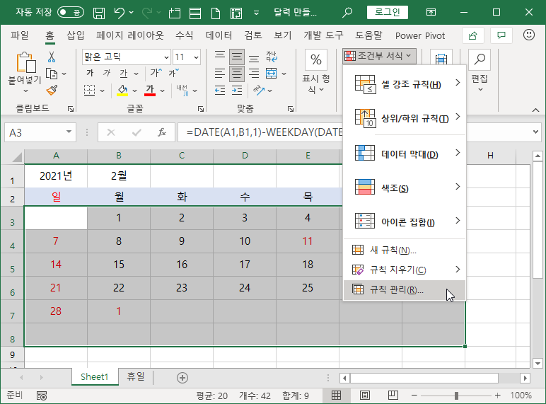 달력 만들기 - 날짜 함수, 조건부 서식, 유효성 검사, 표시 형식