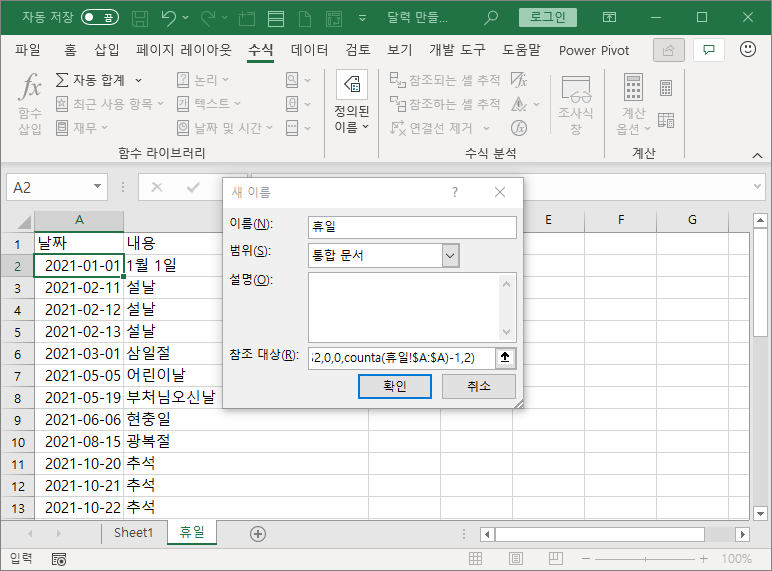 이름을 휴일로 지정하고 참조 대상에 OFFSET 함수와 COUNTA 함수를 이용해 수식을 작성합니다.