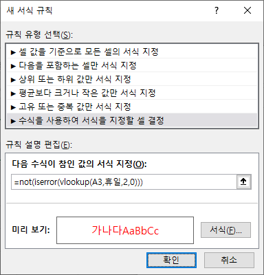 =NOT(ISERROR(VLOOKUP(A3,휴일,2,0)))