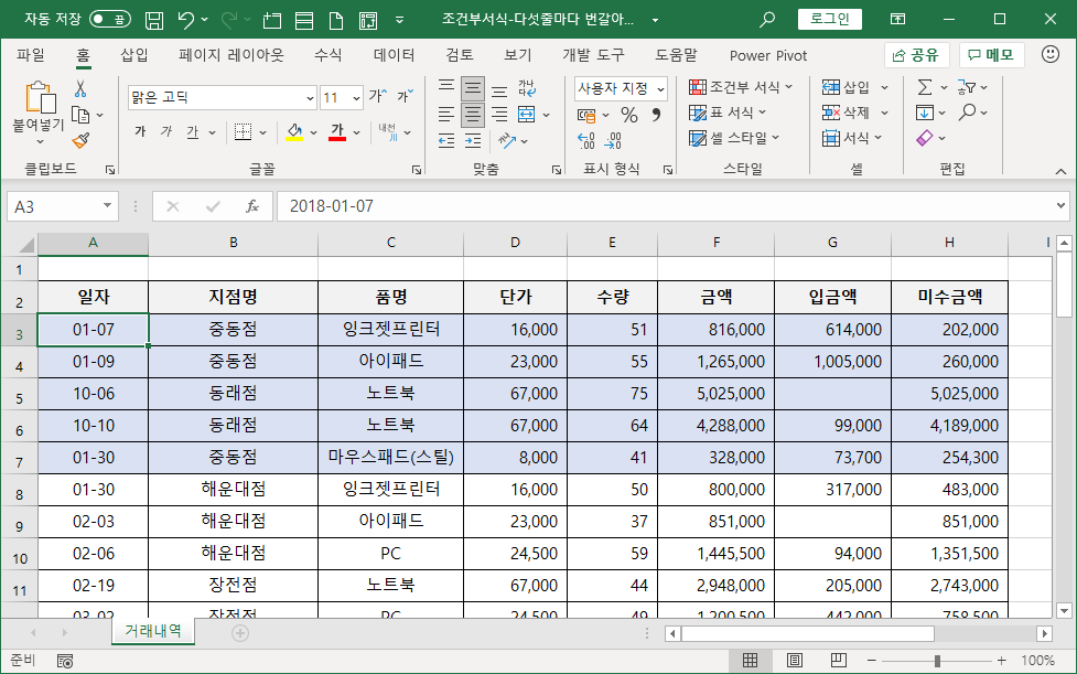 일자별 거래내역이 가득 입력된 데이터를 열어보면 눈이 뱅글뱅글 ㅋㅋ 데이터의 가독성을 높이기 위해 한 행씩 걸러 색상을 채우는 조건부 서식을 작성해보겠습니다. 아래 예제로 사용할 데