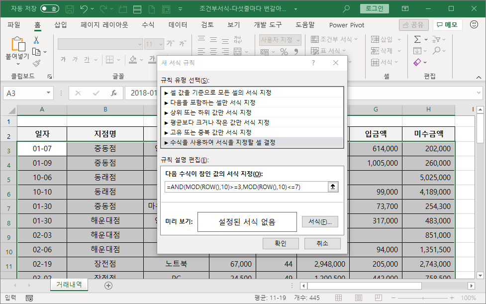 이번에는 다섯줄마다 번갈아 채우기 색이 나타나도록 조건부 서식을 지정하겠습니다.