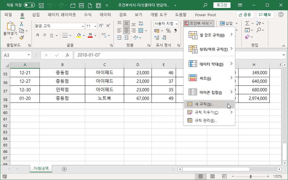 [A3:H58] 셀 범위를 선택하고 [홈]-[스타일]-[조건부 서식]-[새 규칙]을 선택합니다.