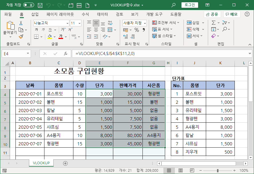 VLOOKUP 함수로 단가를 구한 경우에 생길 수 있는 문제와 이 문제 해결하는 방법을 예로 들어 소개하겠습니다.
