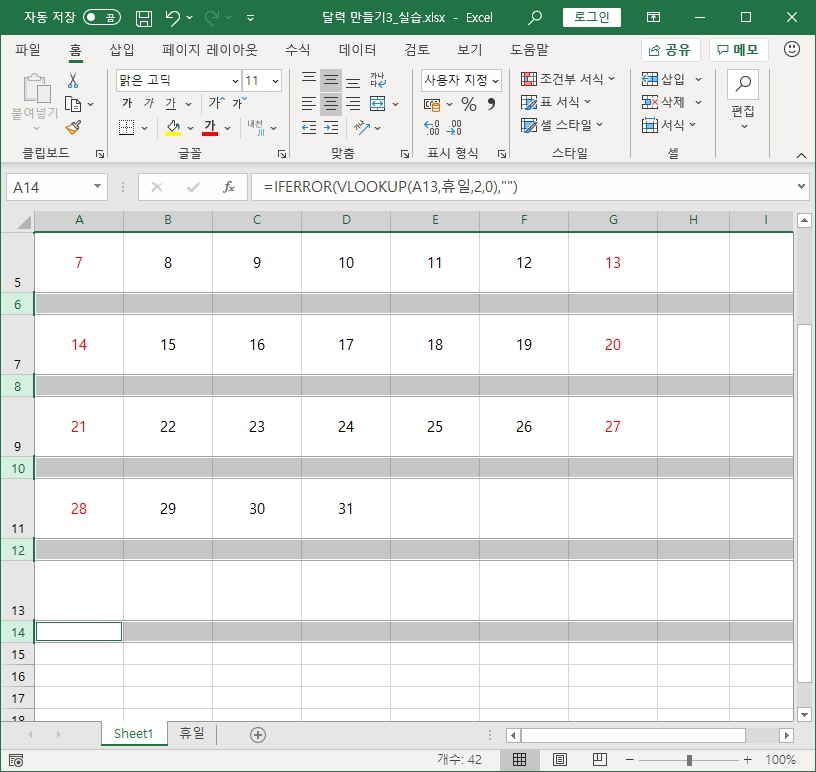 날짜가 표시되는 행은 행높이를 45로 늘리고, 휴일 내용이 표시되는 행은 행높이를 16.5로 줄입니다.