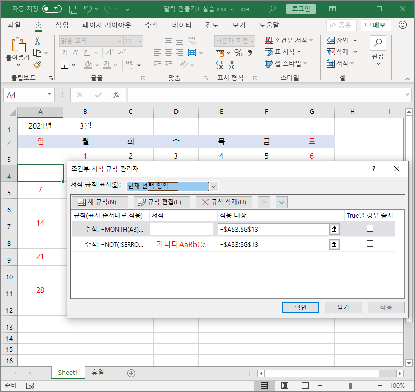 [A4] 셀에 수식을 입력하면 화면에 표시되지 않는데, 조건부 서식에서 현재 월이 아닌 경우 글자색을 흰색으로 설정해 두었기 때문입니다.
