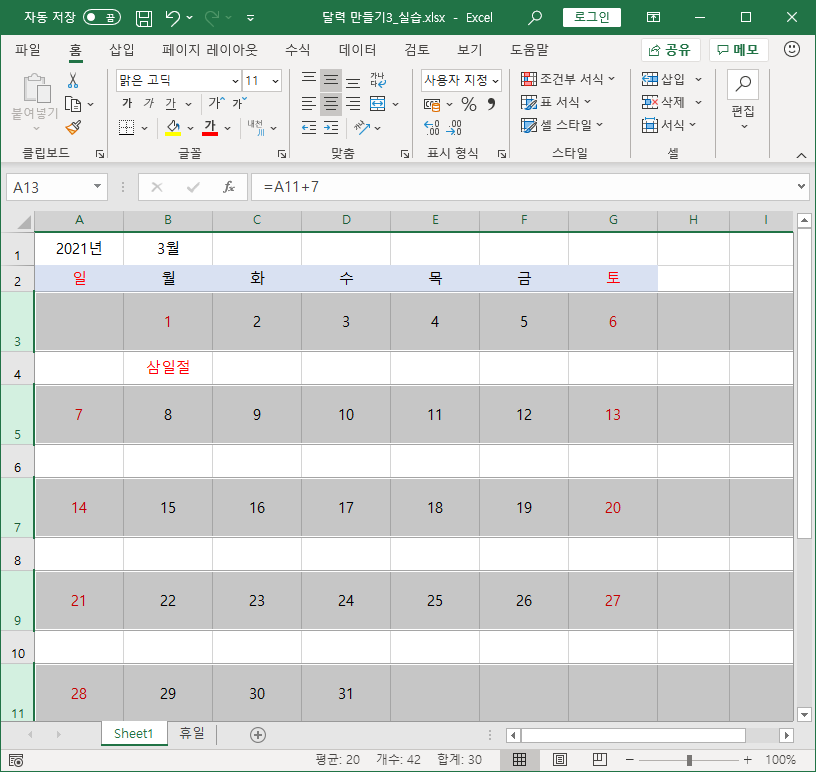 조건부 서식과 날짜 관련 함수, 그리고 휴일 시트를 이용해 달력을 만들어 보았습니다.