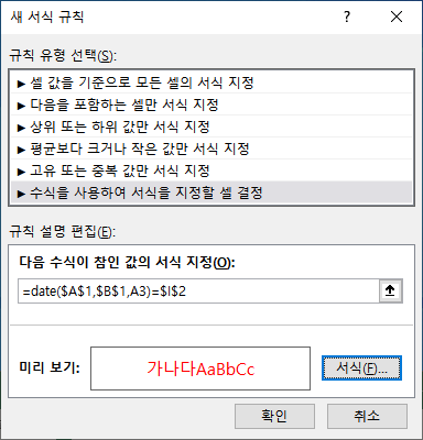 [다음 수식이 참인 값의 서식 지정]에 커서를 두고 수식을 작성합니다.