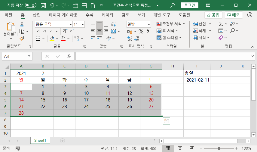 달력으로 나타낸 영역에서 사용자가 입력한 특정 날짜를 휴일에 해당하는 글꼴 색으로 조건부 서식을 이용해 나타내는 방법을 소개하겠습니다.
