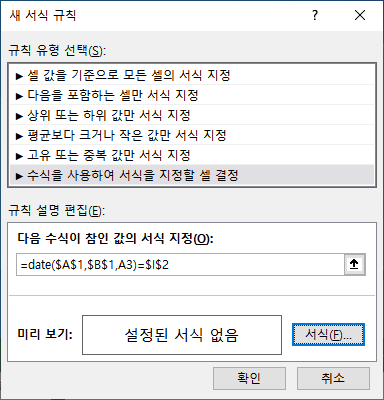 [새 서식 규칙] 대화상자에서 [수식을 사용하여 서식을 지정할 셀 결정]을 선택합니다.