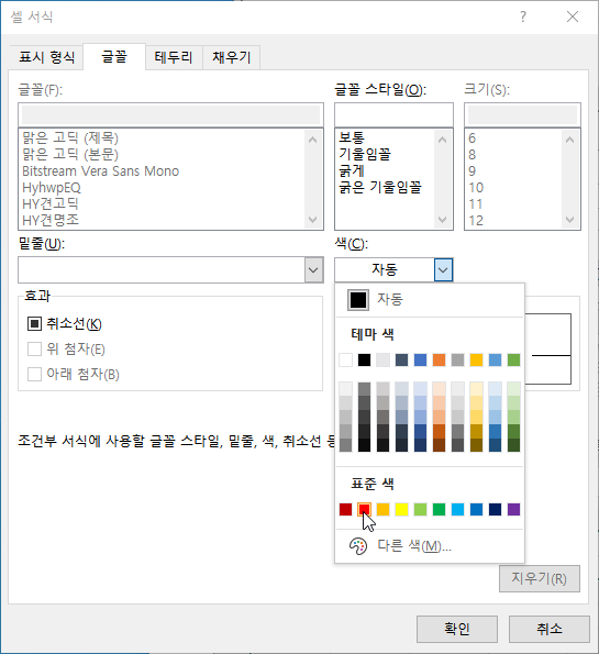 [서식] 단추를 눌러 [셀 서식] 대화 상자에서 [글꼴] 탭 [색] 항목에서 원하는 색을 선택합니다.