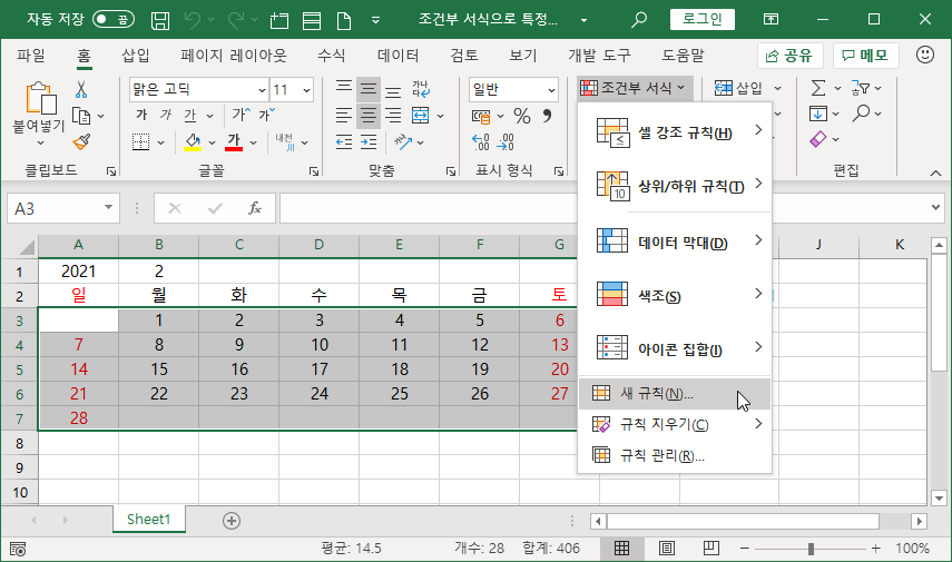 [홈]-[스타일]-[조건부 서식]-[새 규칙]을 선택합니다.
