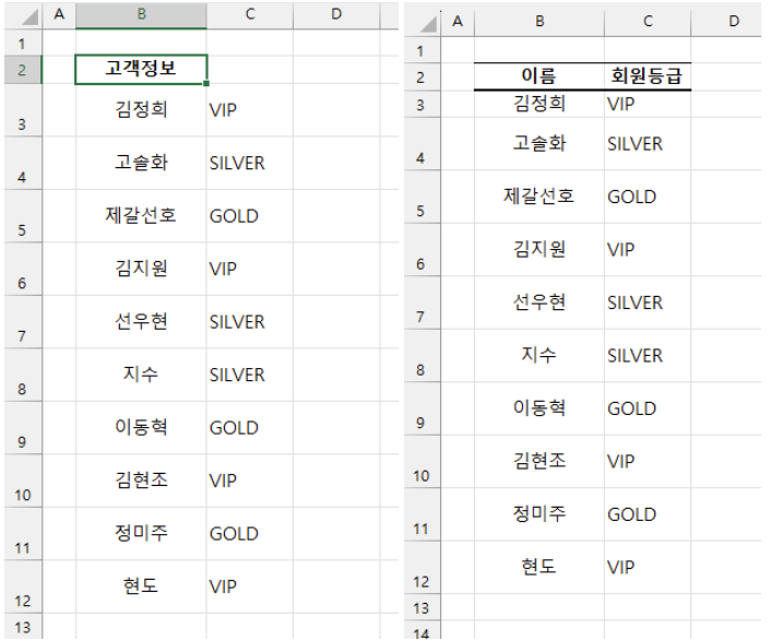 쉽게 나누어졌죠? 고객정보를 '이름', 바로 옆에 셀에 '회원등급'을 입력합니다.